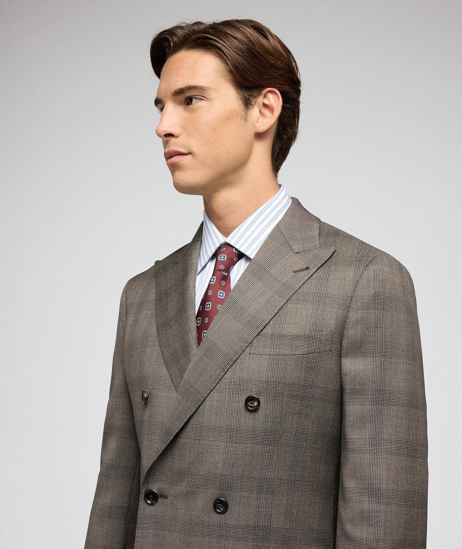 Abito realizzato Su Misura con un tessuto in lana del lanificio Vitale Barberis Canonico. Questo tessuto è caratterizzato da una fantasia Principe di Galles su fondo resca, che mescola nuances canna di fucile con un leggero overcheck azzurro. Un capo raffinato e insieme confortevole, da indossare tutti i giorni in ufficio.